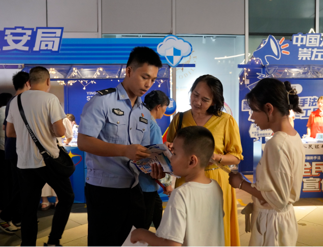 7月16日晚,一场别开生面的“反诈嘉年华”在崇左市万象汇的广场上掀起热潮。崇左市公安局携手江州分局、中国人民银行崇左市分行、广西城市职业大学、桂林银行崇左分行、中国移动崇左分公司、中国电信崇左分公司等单位围绕“警惕诈骗新手法,不做电诈工具人”主题,以防诈反诈为主要内容,组织开展线下活动统一宣传,向辖区百姓揭秘“电诈工具人”,进一步增强人民群众防范电信网络诈骗的意识。