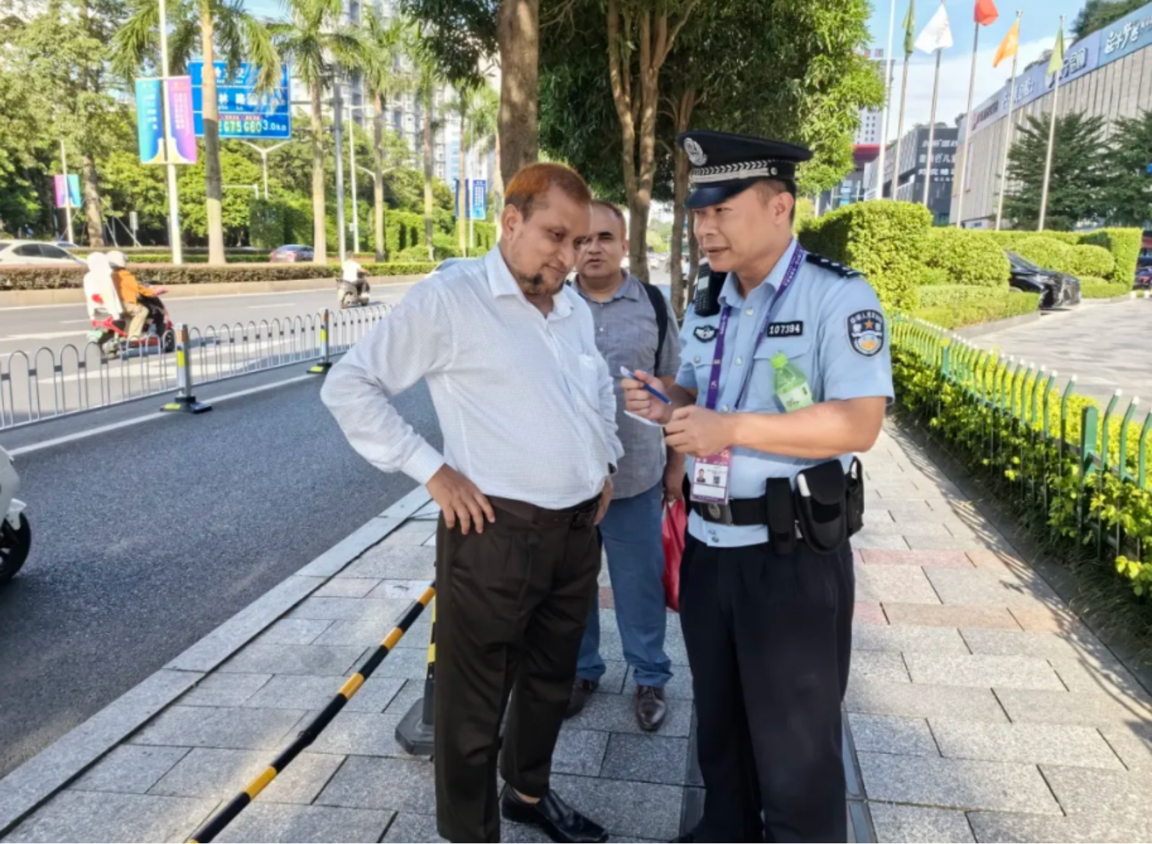 9月17日上午,在南宁国际会展中心D3展厅入口处,一位外籍客商来到南宁市公安局会展中心服务点寻求帮助。