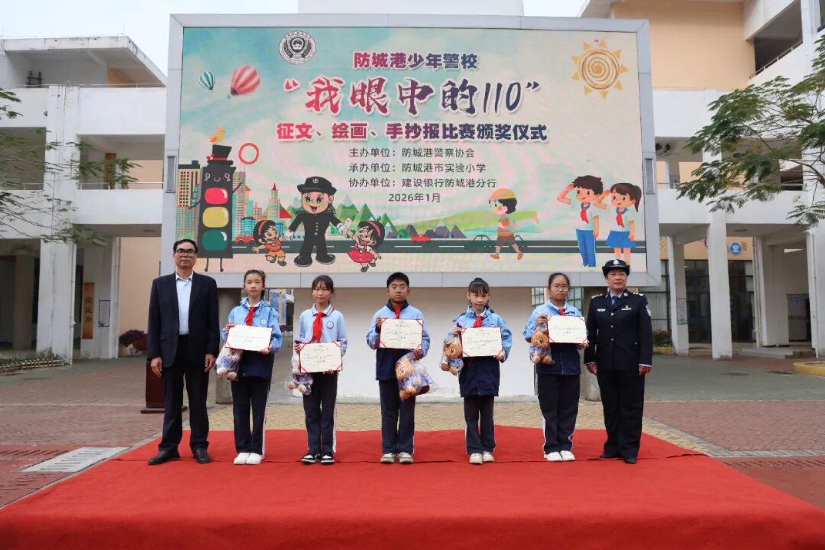 2026年1月16日,防城港警察协会、中国建设银行防城港分行携手走进防城港市实验小学,以“我眼中的110”征文、绘画、手抄报创作比赛颁奖仪式为契机,开展“新年第一堂法治课”、“110知识讲座”等少年警校系列活动,用沉浸式互动教学,为全体师生送上一份平安大礼。